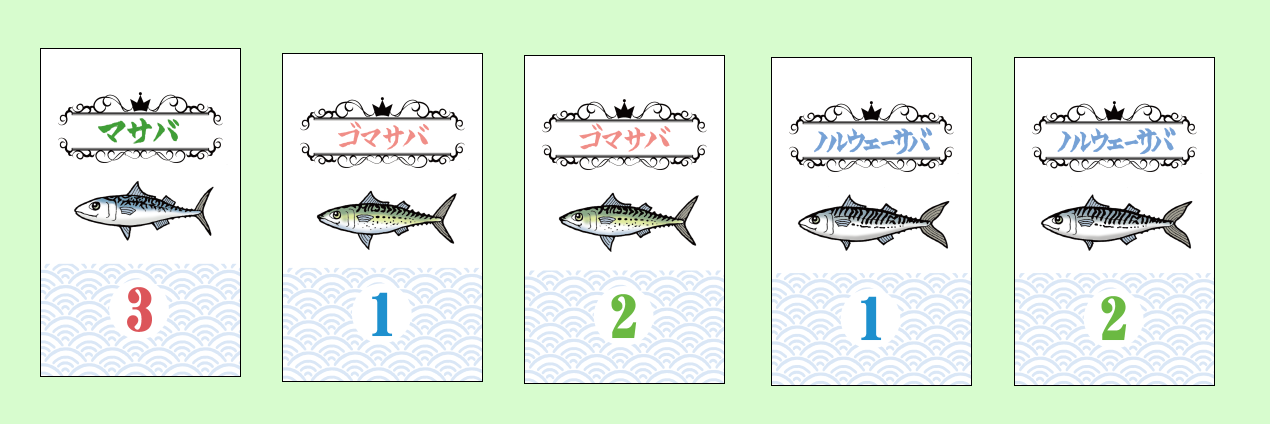 たとえば、親がノルウェーサバ①を選んでいて、子も同じカードを出していた場合(出した枚数に関わらず)、子は1点を獲得します。