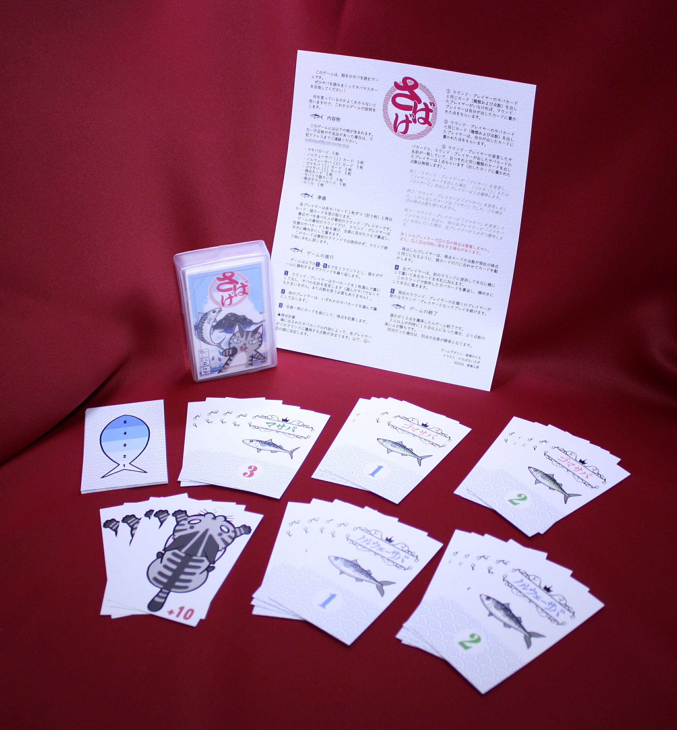 まずゲームの準備として、各プレイヤーに5枚のサバカード(マサバ、ゴマサバ①②、ノルウェーサバ①②)と、猫カードと得点カードを配ります。