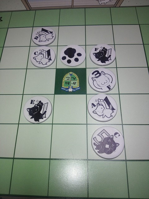 まず、最初の配置は写真のとおり、真ん中のマス(ここには置けません)を挟んで「1」のねこをそれぞれ置きます。